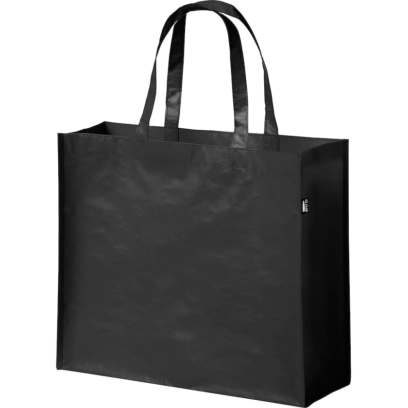 Sac à provisions laminé en rPET, c'est-à-dire en bouteilles PET. L'un des côtés du sac comporte une étiquette qui indique qu'il est en rPET.