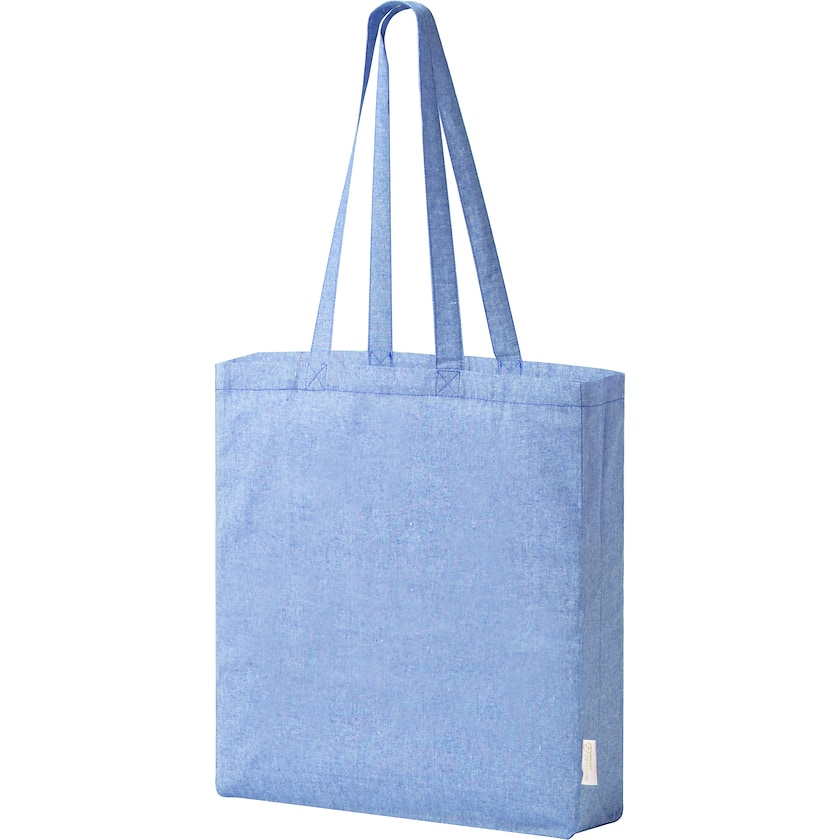 Sac en tissu à fond large en coton recyclé. Cannes possède de longues anses qui permettent de le porter facilement en bandoulière. Le sac est muni d'une étiquette indiquant qu'il est composé à 100% de coton recyclé.