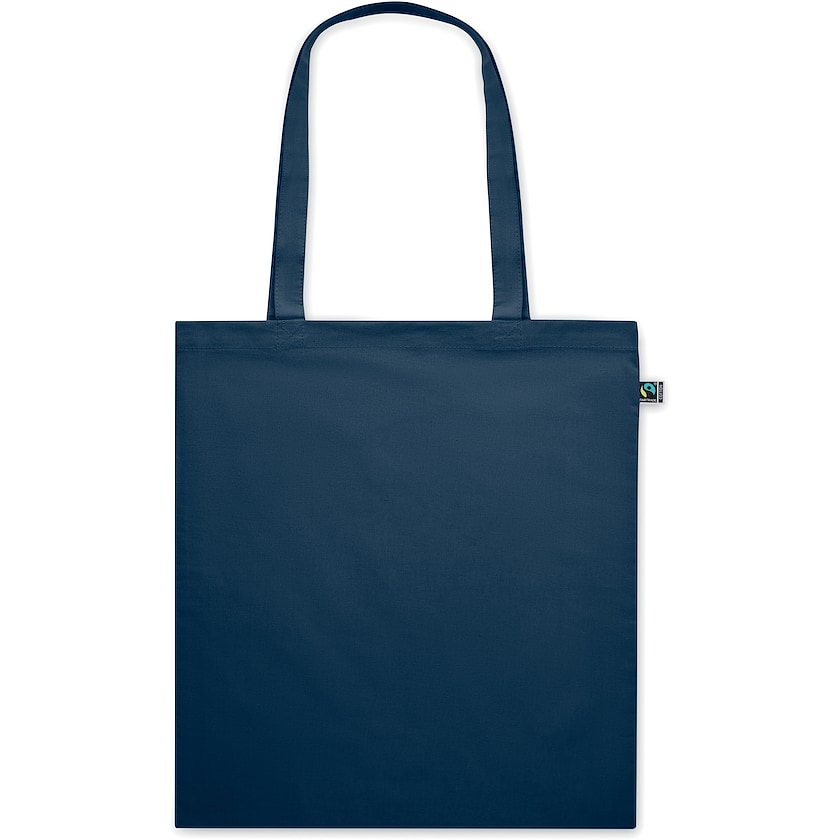 Sac en coton de 140 grammes certifié Fairtrade. Le sac a de longues poignées. Bon prix et délai de livraison rapide.