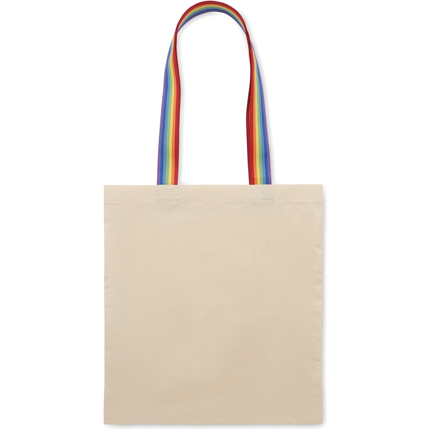 Sac en coton avec des anses aux couleurs de l'arc-en-ciel. Le tissu est en coton de 180 grammes. Le poids maximal est de 2,5 kg.