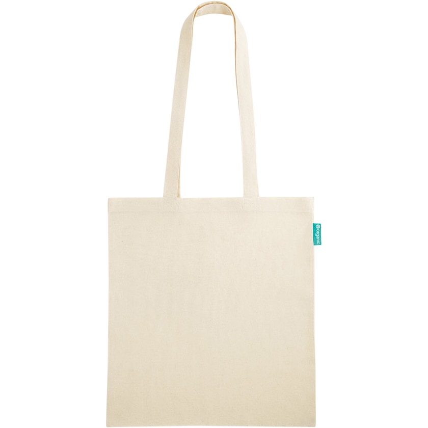 Sac en coton 100% écologique. Le coton est produit dans des conditions durables sans produits chimiques ou pesticide. Les anses mesurent 60 cm de long. Sur un des côtés du sac, une étiquette indique que le sac est fabriqué en coton écologique.