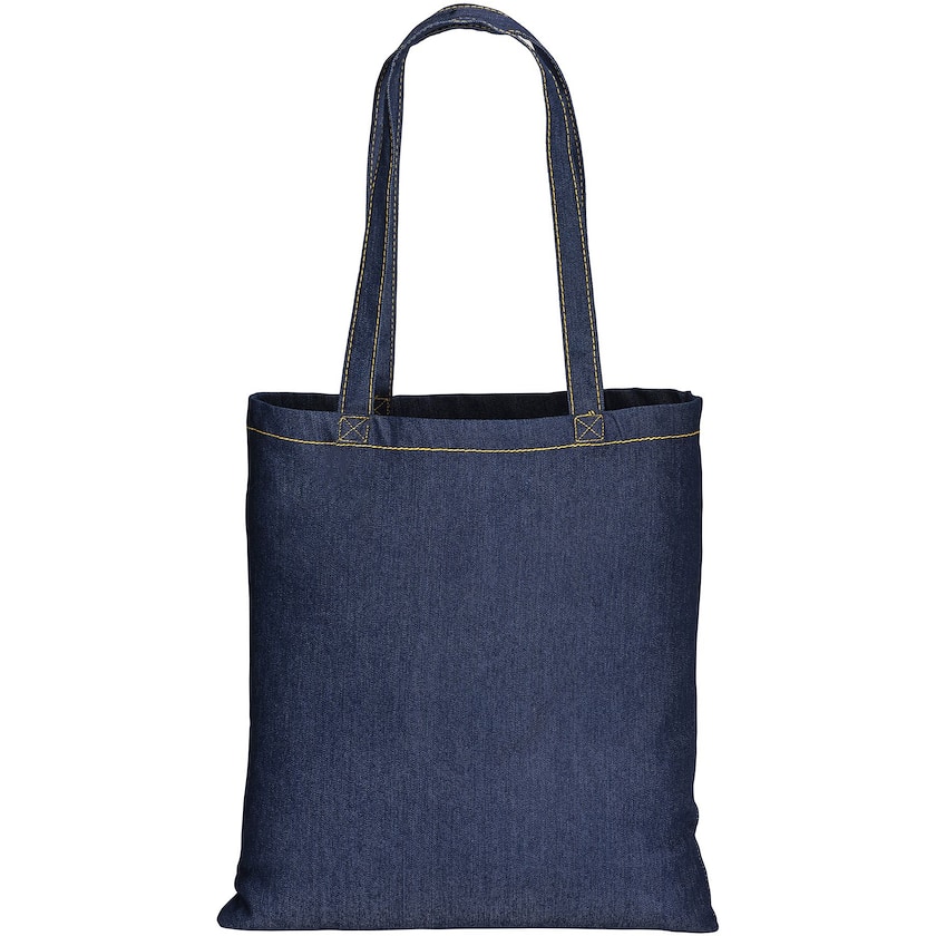 Sac en tissu denim en coton recyclé. Son tissu denim et ses couture jaunes donnent au sac une apparence unique et attirante.
