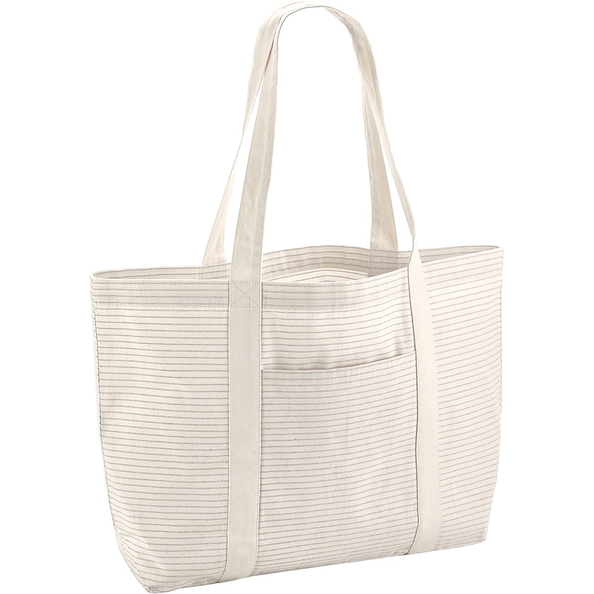 Magnifique sac en coton avec tissu rayé. Le sac est fait d'un tissu solide de 200 grammes de coton biologique. Il y a une poche spacieuse à l'avant. Peut être porté en bandoulière ou à la main.