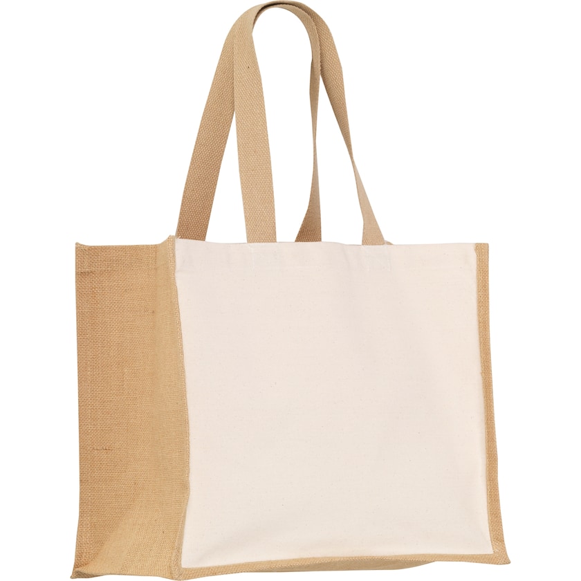 Sac en toile de jute avec détails en toile de coton. Le sac possède de longues anses. Un sac en toile de jute de haute qualité.