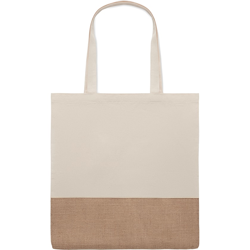 Sac en coton avec partie basse en jute. Le sac en tissu possède de longues anses. Un sac en tissu fabriqué dans des matériaux naturels, plein de charme.