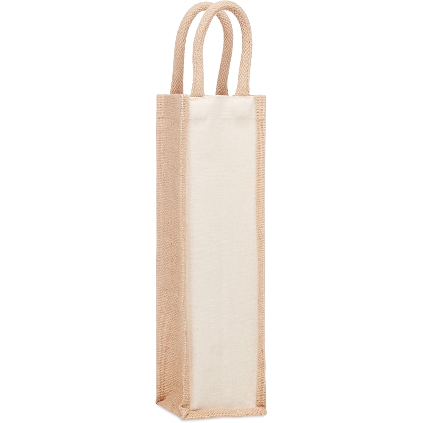 Sac pour bouteilles de vin en toile de jute et coton. Faites une surprise à quelqu'un de spécial avec un bon vin. L'impression est réalisée sur la toile de coton. La bouteille de vin n'est pas incluse.