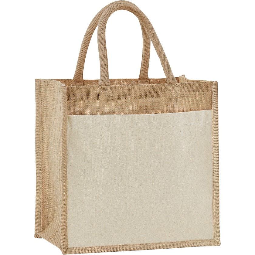 Sac en jute avec poche en coton sur le devant. Le tissu de jute n'est pas laminé, ce qui donne à la boîte un aspect naturel. Les poignées sont en coton.