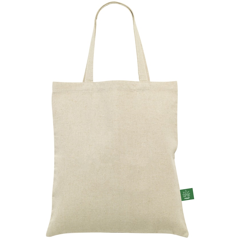Sac en chanvre résistant. Le sac en tissu possède de longues anses. Sur un des côtés, une étiquette indique que le sac est fabriqué en chanvre. Le chanvre est un matériau à la fois résistant et écologique. La culture du chanvre nécessite par exemple 35% moins d'eau que celle du coton. De plus, les racines du chanvre nettoient la terre de substances nocives.
