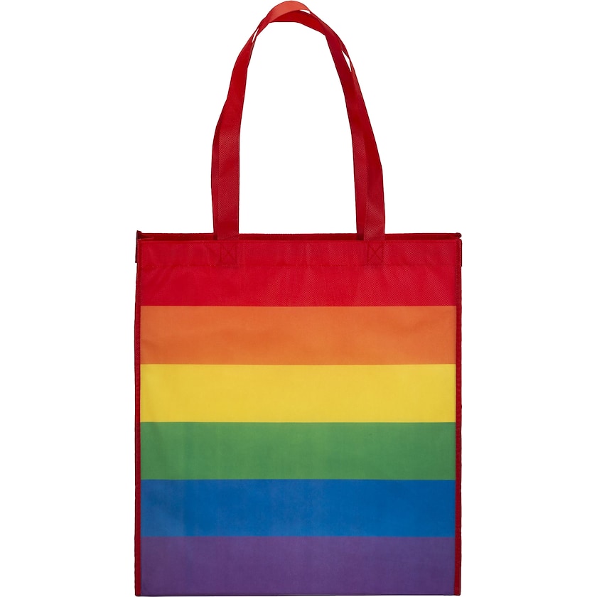 Sac respectueux de l'environnement de couleur arc-en-ciel avec un fond large. Dorian est fabriqué à partir de rPET, c'est-à-dire de bouteilles PET recyclées. Seule une impression en 1 couleur est possible.