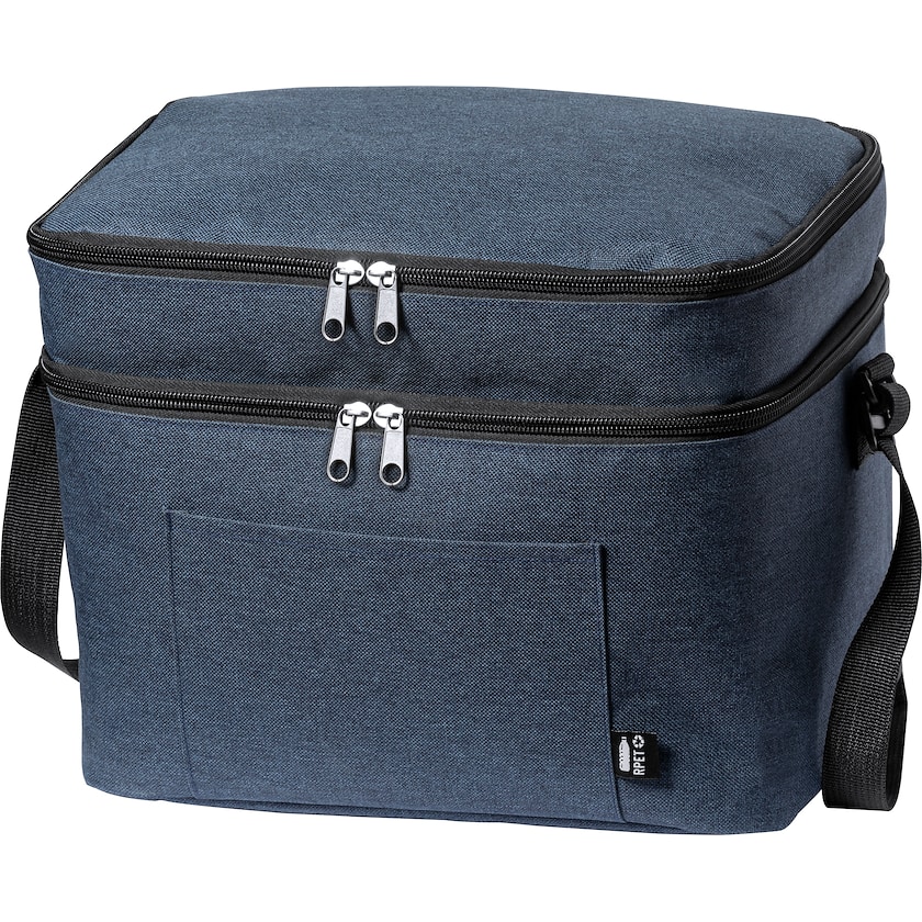 Grand sac isotherme en tissu fabriqué à partir de matériau recyclé. Le sac isotherme possède deux compartiments à fermeture éclair et une bandoulière réglable.