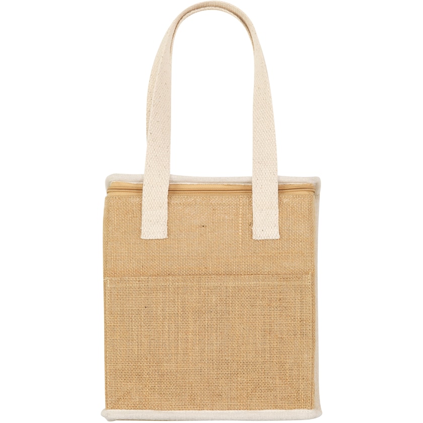 Sac isotherme personnalisable en toile de jute et coton. Sur le devant, le sac propose une poche pour les petits accessoires. Le sac isotherme peut contenir 8 litres. Personnalisation par impression monochrome uniquement.
