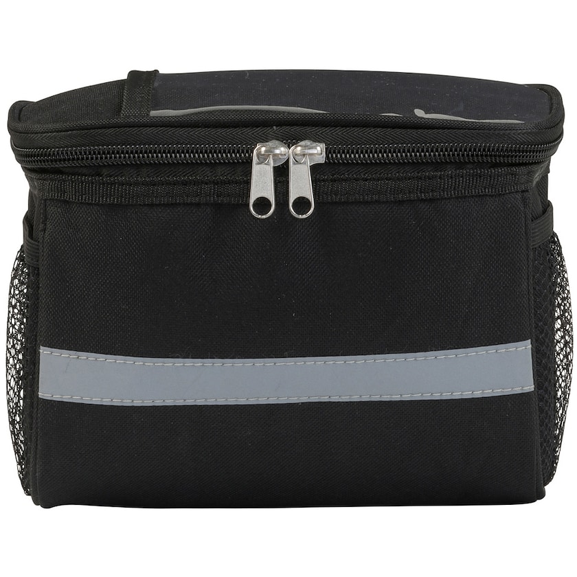 Petite glacière souple pour vélo. La glacière possède un compartiment de rangement transparent sur le rabat où ranger son téléphone portable ou une carte par exemple. Une bande réfléchissante court sur la face avant de la glacière.