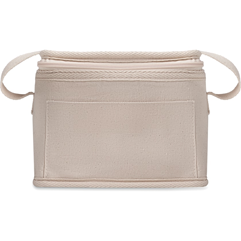 Sac isotherme en toile de coton résistante couleur nature. Sur le devant se trouve une petite poche de rangement.