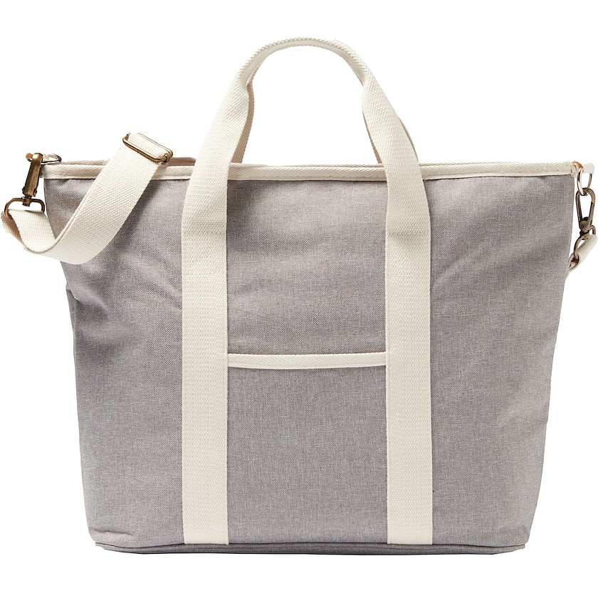 Sac isotherme écologique en coton et cuir synthétique. Un sac isotherme pour pique-niquer avec style ! Son tissu est composé à 50% de matériau recyclé provenant de bouteilles PET. Grâce à une épaisse doublure PEVA, la glacière garde la fraîcheur plus longtemps.
