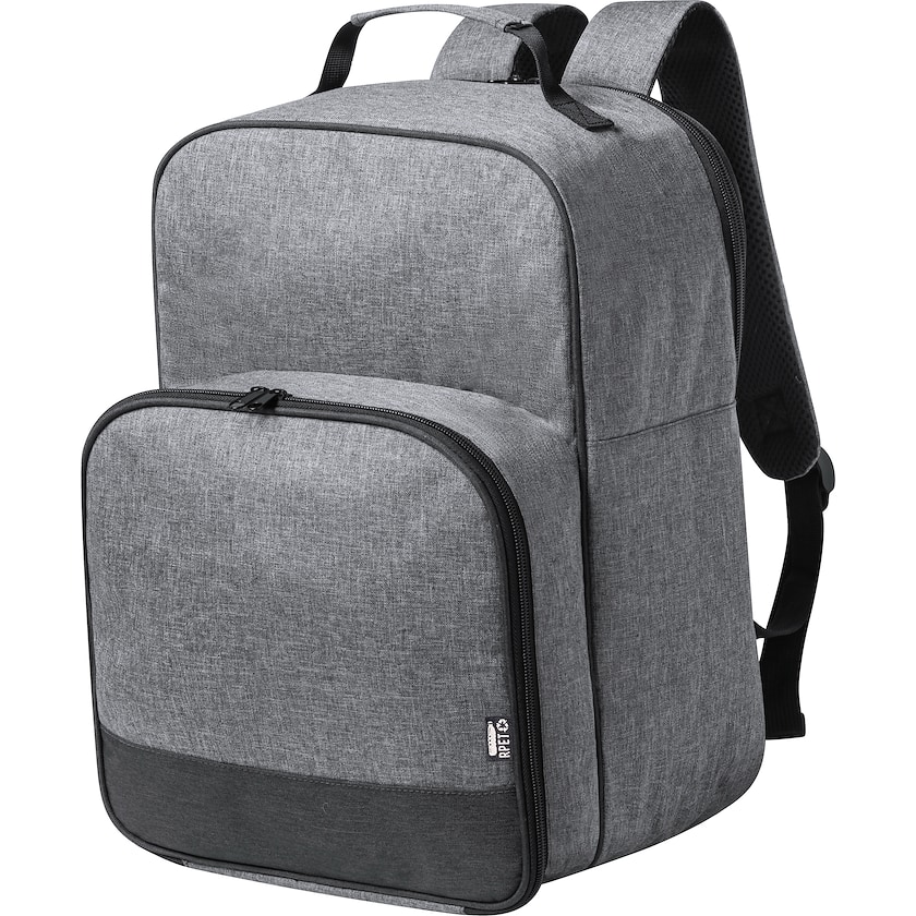 Sac isotherme unique avec set de pique-nique. Le sac isotherme est fabriqué en rPET, c'est-à-dire en bouteilles PET recyclées. Le set de pique-nique comprend deux verres, deux couteaux, deux fourchettes, deux cuillères, deux assiettes et deux serviettes.