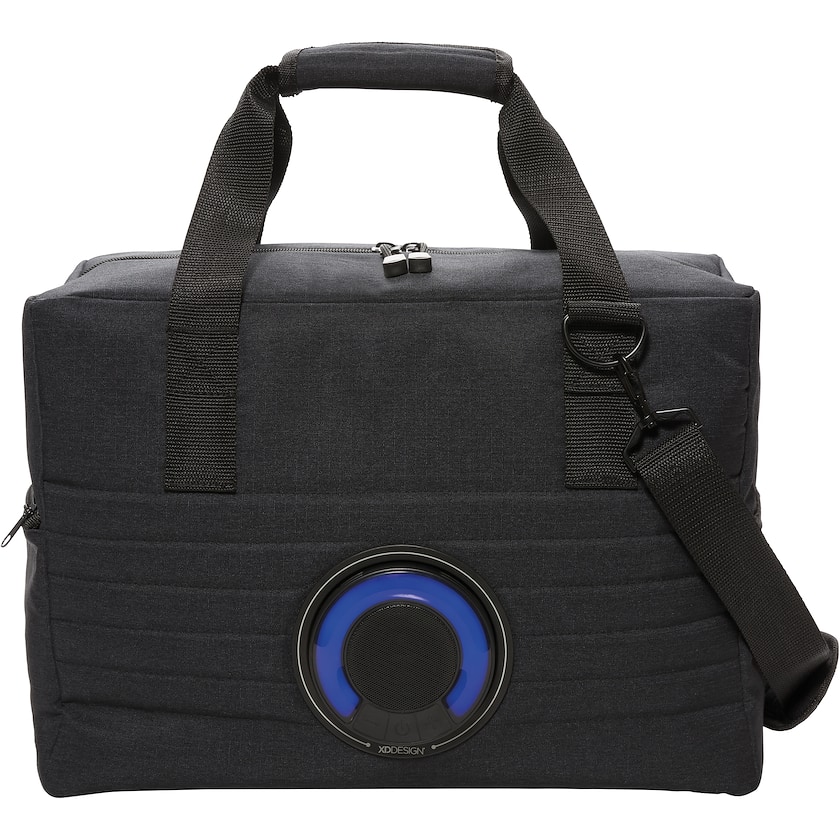 Grande glacière souple avec enceinte sans fil détachable. La glacière souple peut contenir jusqu'à 32 canettes et est équipée d'une bandoulière. L'enceinte possède une autonomie de jeu de 5 heures et est équipée de LED qui changent de couleurs. Design protégé par copyright.