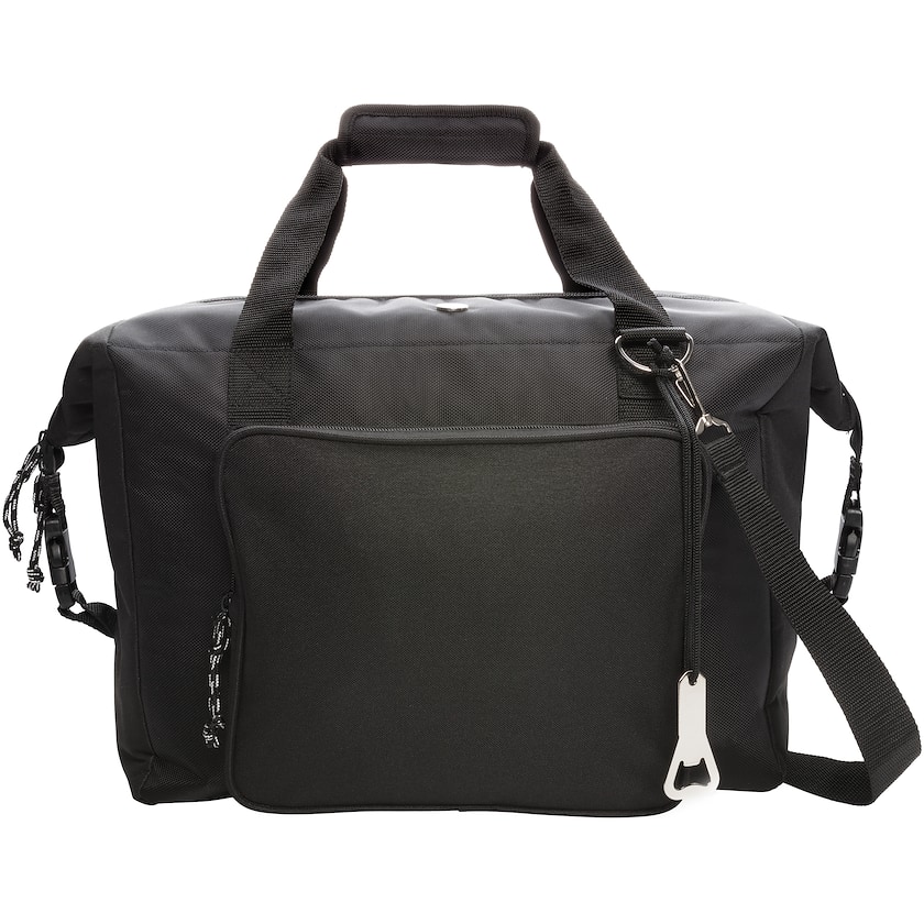 Grande glacière exclusive Swiss Peak. La glacière possède une capacité de 40 litres, soit 10 bouteilles de 1,5L ou 52 canettes de 33 cl. À l'avant se trouve une large poche de rangement pour les petits objets. La glacière est équipée d'un décapsuleur. La bandoulière est rembourrée, ajustable et détachable.