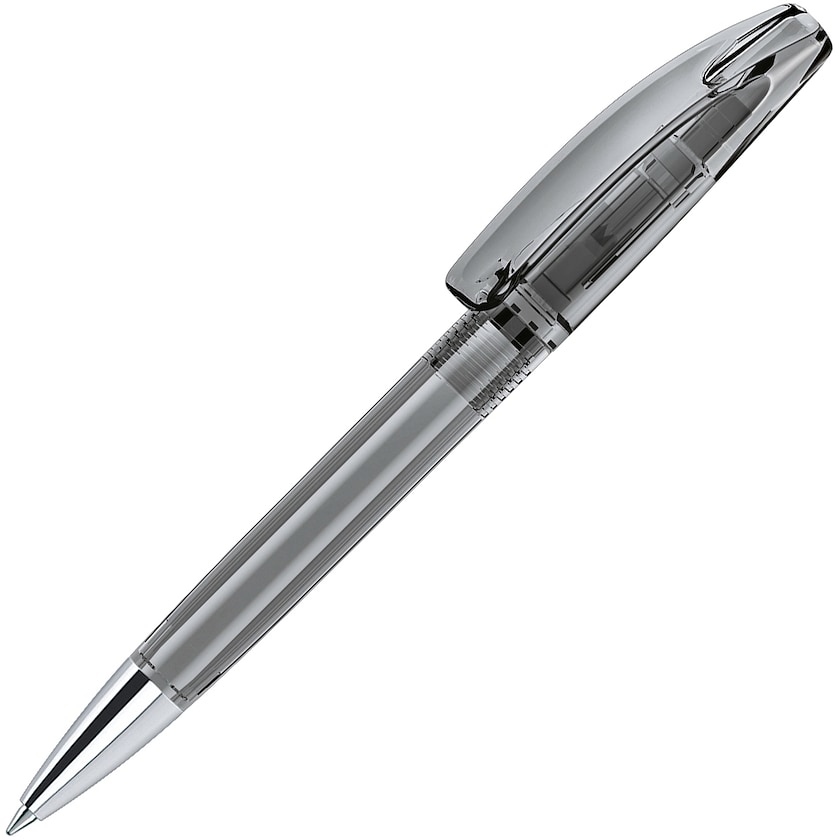 Beau stylo publicitaire avec corps transparent et pointe en métal chromé. Le stylo possède un mécanisme à rotation et est disponible avec encre bleue ou noire.