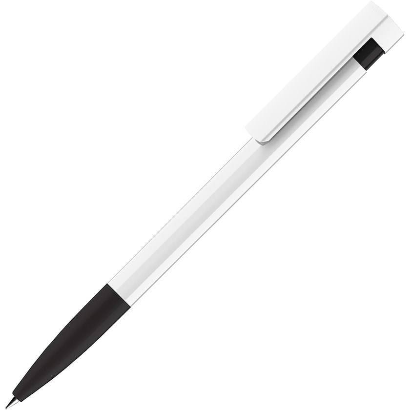 Stylo publicitaire de haute qualité avec corps blanc et détails de couleur contrastante. Le stylo est disponible avec encre noire ou bleue. Un beau stylo au design épuré.