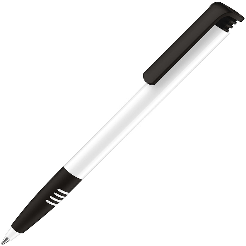Stylo publicitaire économique Senator® avec zone de préhension. Le stylo possède un corps blanc, des détails de couleur contrastante et une zone de préhension colorée. Choisissez entre une encre bleue ou noire.