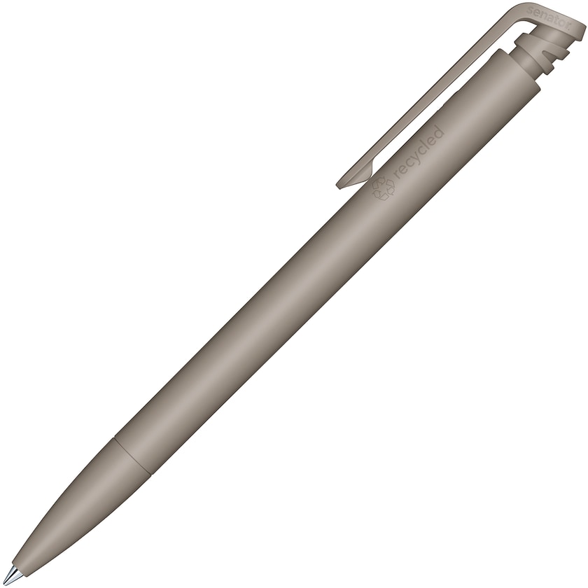 Stylo personnalisé en plastique recyclé. Le stylo possède une surface mate permettant une bonne prise en main. La cartouche d'encre du stylo est de type "Magic Flow" et permet d'écrire sur 5000 mètres. Vous pouvez choisir entre encre bleue ou noire. À partir de 1000 unités, la surface d'impression est de pas moins de 60 x 30 mm. Sur le corps du stylo est imprimée la mention "Recycled Material".