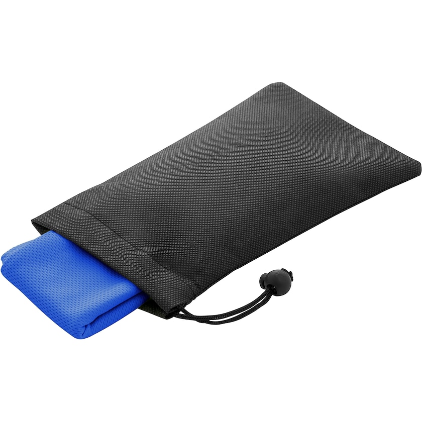 Serviette de sport écologique dans un sac de rangement noir. La serviette est fraîche, même lorsqu'elle est mouillée. La serviette est fabriquée en rPET, c'est-à-dire en bouteilles PET recyclées. Le sac de rangement est en matériau non tissé. La surface d'impression sur la serviette mesure 100 x 60 mm, celle du sac de rangement 140 x 80 mm.
