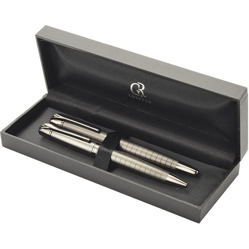 Set de stylos haut de gamme avec des stylos au design moderne. Le set comprend un stylo bille et un stylo roller en métal. Le prix de la gravure laser fait référence à la personnalisation de l'un des stylos. Un choix parfait pour vous qui recherchez un set de stylos au design moderne. Les stylos sont à encre noire.
