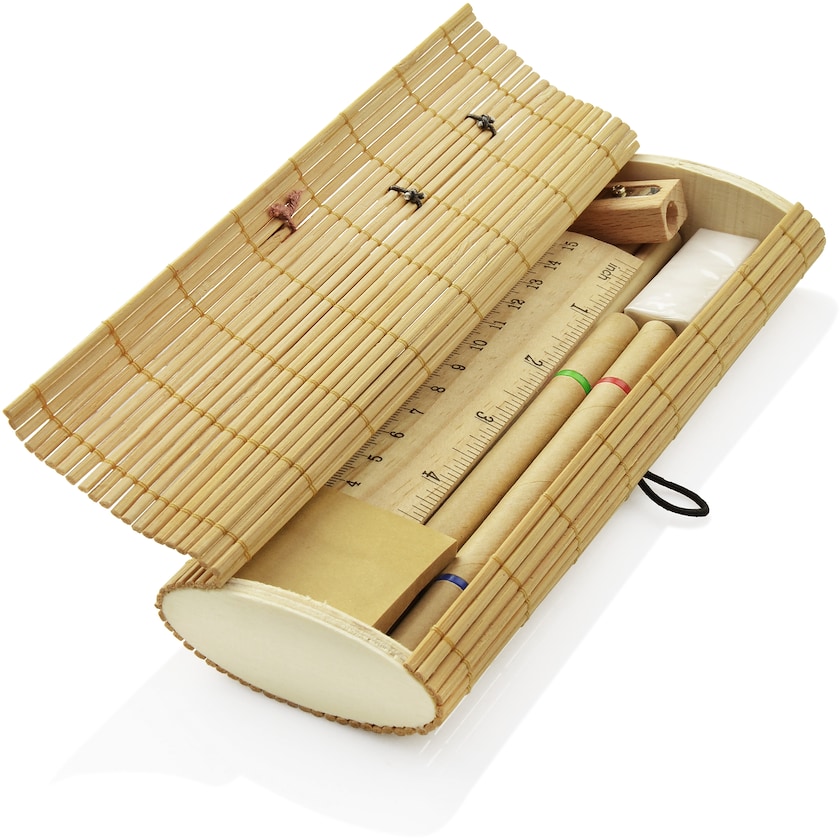 Joli set de stylo en bambou. Le set de stylos contient deux stylos à encre avec de l'encre rouge, bleue, noire et verte, deux crayons à papier, une gomme, un taille-crayon et une règle en bois. Le marquage s'effectue par gravure laser sur la plaque en bois présente sur l'étui des stylos.