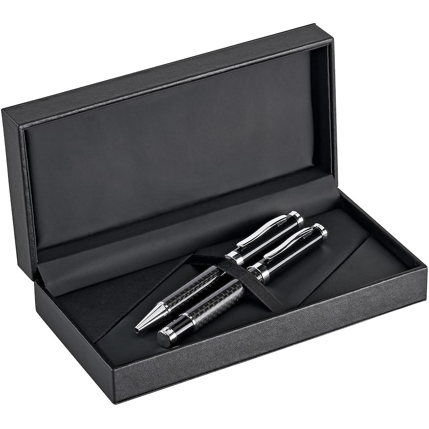 Set exclusif de deux stylos en métal et fibres de carbone. Le set comprend un stylo bille et un stylo roller. Le stylo à bille possède un mécanisme de rotation. Les stylos sont à encre noire. Le prix de la personnalisation fait référence à la personnalisation d'un des stylos.
