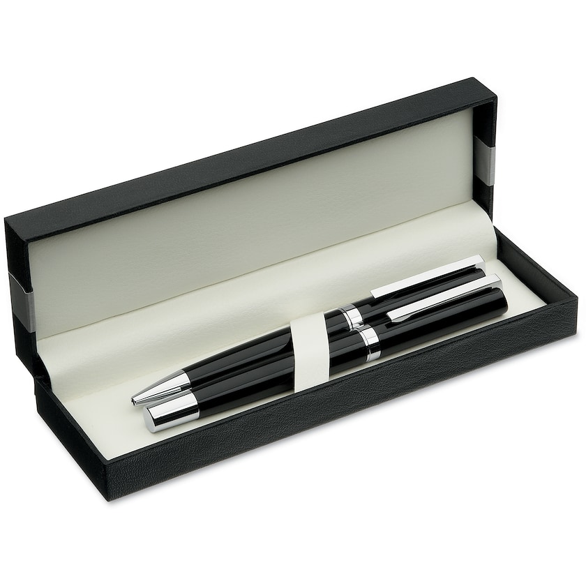 Set de stylos noir dans une jolie boîte cadeau. Le set comprend un stylo bille et un stylo roller. L'impression peut être effectuée en 2 couleurs maximum.