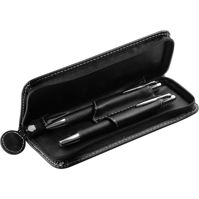 Deux stylos en métal dans un étui pratique en cuir synthétique. L'un des stylos est un stylo bille et l'autre un stylo roller. Le prix pour la gravure inclut la personnalisation des deux stylos.