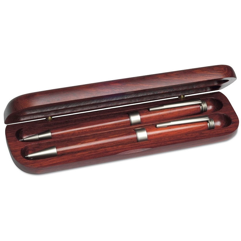 Set de stylos exclusif dans une boîte en bois. Le set comporte un stylo bille et un portemine.