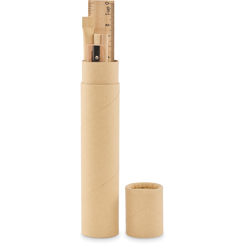 Coffret stylo dans un tube en carton de couleur naturelle. Le coffret contient 2 crayons, 1 stylo à bille, 1 taille-crayon et 1 gomme. L'impression est réalisée sur le tube en carton.
