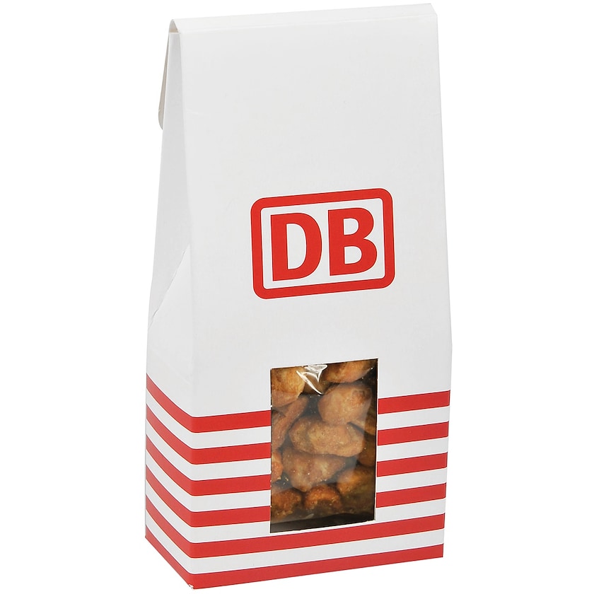 40 grammes de cacahuètes caramélisées dans un emballage avec imprimé personnalisé. Ces délicieuses cacahuètes feront un cadeau parfait pour clients comme employés. Téléchargez le template d'impression et créez un emballage vraiment unique pour vos cacahuètes!