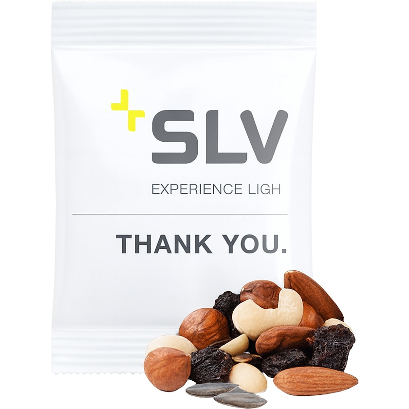Délicieux mélange de noix dans un emballage avec imprimé personnalisé. Contient un délicieux mélange noix de cajou, amandes, raisins secs, noisettes, graines de citrouille et cacahuètes. L'intégralité de l'emballage est personnalisé entièrement suivant vos souhaits.
