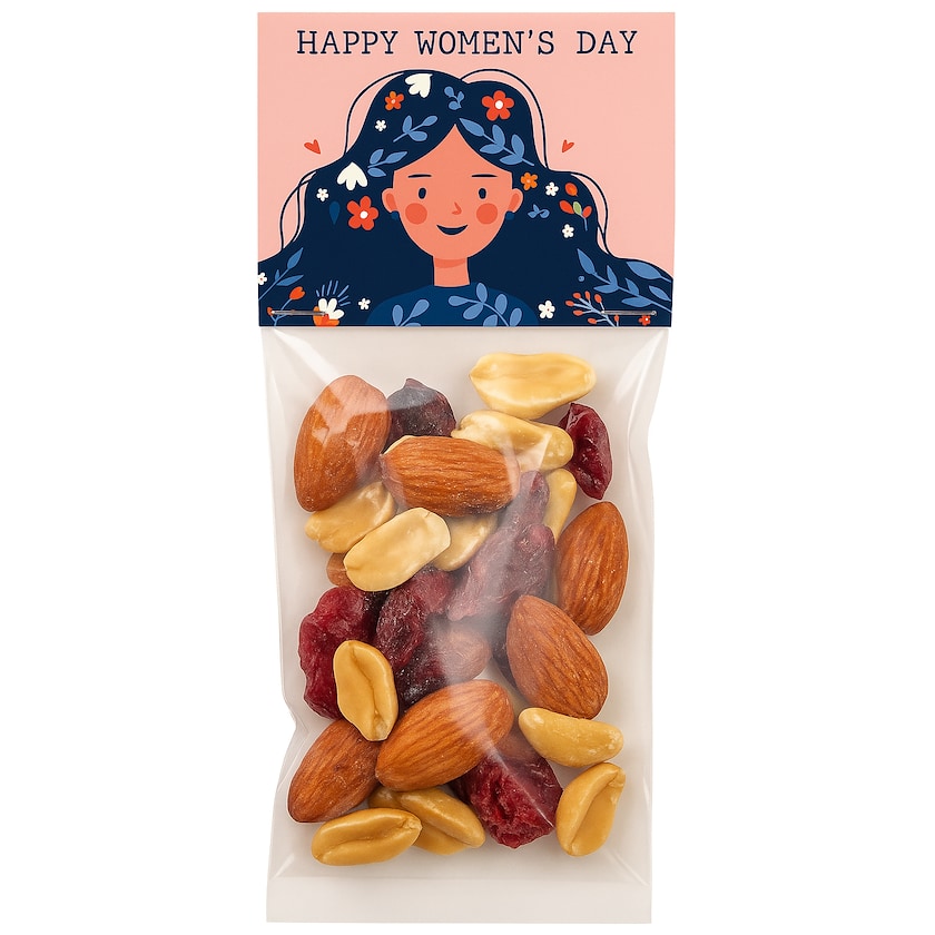 Emballage pouvant être obtenu avec différents types de mélanges de noix. La carte est entièrement imprimée selon vos souhaits. Choisissez parmi six mélanges de noix différents.