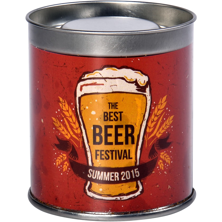 Boîte métallique remplie de 40 grammes de partymix. La boîte est entourée d'une bannière en carton avec impression photo en quadrichromie. Que la fête commence!