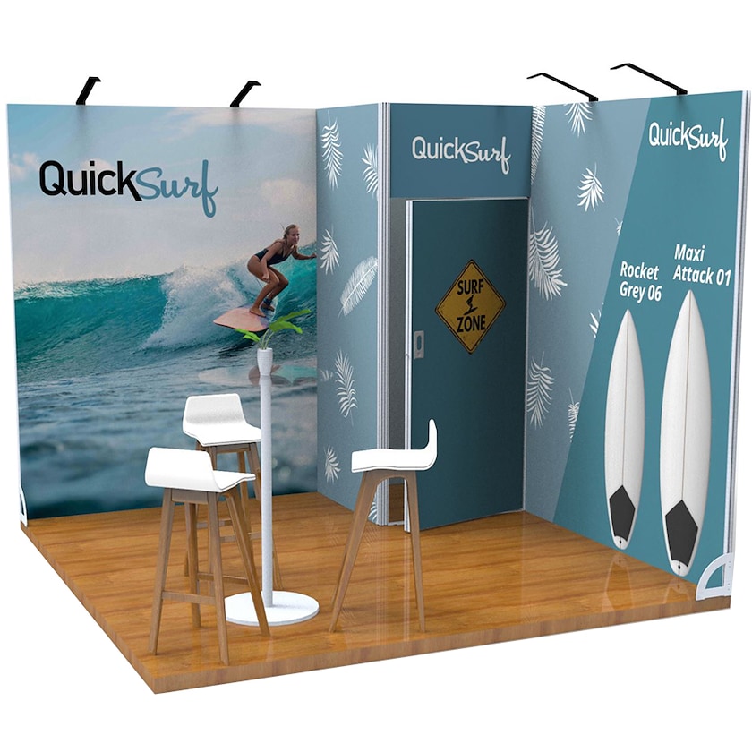 Stand d'exposition de 9 m2 facile à monter. L'ensemble contient deux modules de 200 cm, un module avec porte, deux pieds et un sac de rangement. L'impression s'effectue sur un tissu tendu sur le cadre des modules et fixé avec du ruban silicone. Les cadres des modules sont en aluminium anodisé. Toutes les pièces sont clairement étiquetées pour permettre un assemblage rapide. L'assemblage ne nécessite aucun outil autre que la clé Allen incluse. Si vous souhaitez modifier l'imprimé du stand, il vous suffit de commander chez nous de nouveaux tissus. Des lumières LED et des supports TV peuvent être achetés comme accessoires. Table, chaises et sol non inclus.