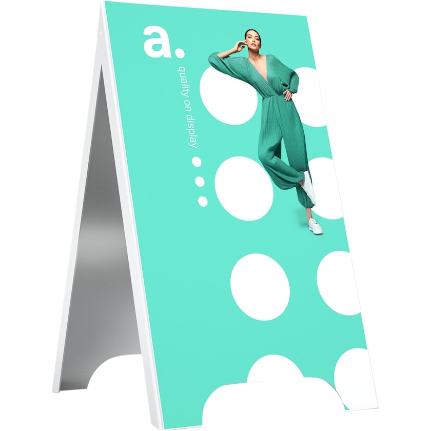 Panneau de rue moderne en polystyrène durable. Le paneau lui-même et l’imprimé peuvent supporter des années d’utilisation. L'utilisation en extérieur ne pose aucun problème. L'impression s'effectue des deux côtés et est protégée par plastification.