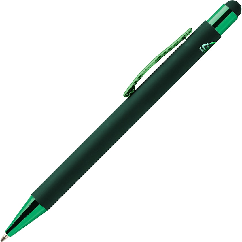 Stylo tactile avec gravure laser qui apparaît en couleur métallique. Adelaide est fabriqué en aluminium recyclé et présente une surface caoutchoutée élégante. La gravure laser est d'une couleur métallique assortie aux parties chromées du stylo.