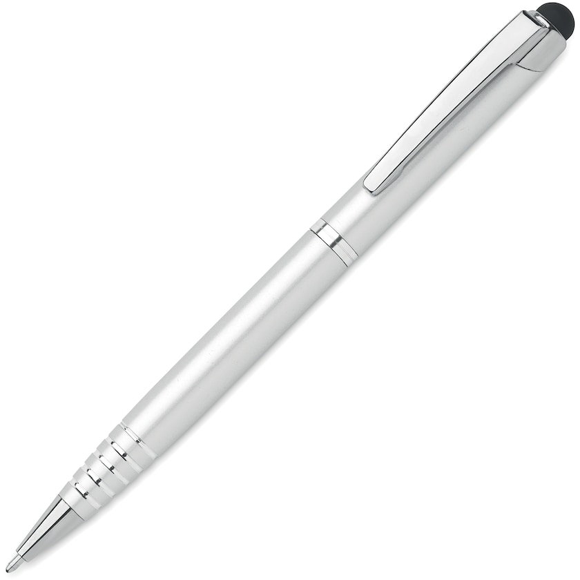Stylo tactile luxueux en aluminium recyclé. Le stylo est doté d'un mécanisme rotatif et d'une encre bleue. Choisissez entre l'impression et la gravure laser.