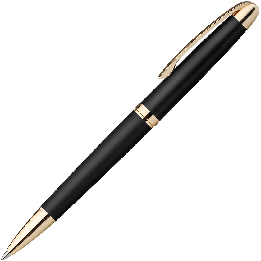 Stylo en métal avec détails dorés. Le stylo possède un mécanisme de rotation et une encre bleue. Livré dans un emballage individuel dans une pochette en carton noir.