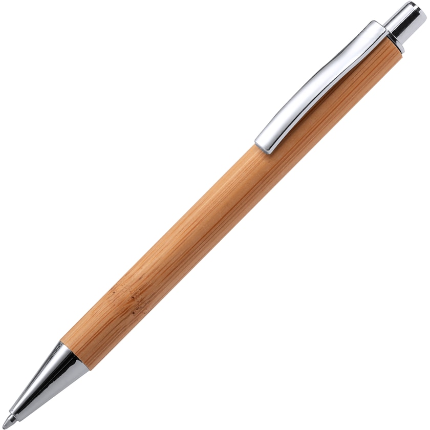 Stylo en bambou véritable avec détails en métal. Le Simone est un stylo à encre bleue. La personnalisation est réalisée soit par impression soit par gravure laser. Un stylo au design épuré qui respire la Nature.