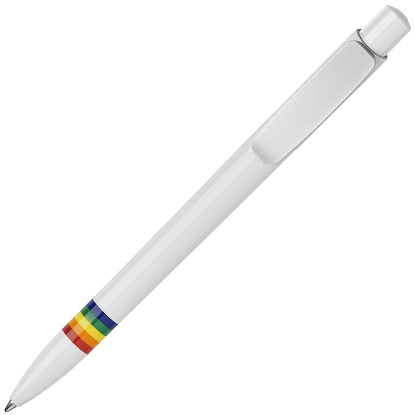 Stylo publicitaire avec bande aux couleurs de l'arc-en-ciel près de la pointe. Le stylo est fabriqué en Italie et est de la plus haute qualité. La personnalisation est réalisée sur le corps du stylo.