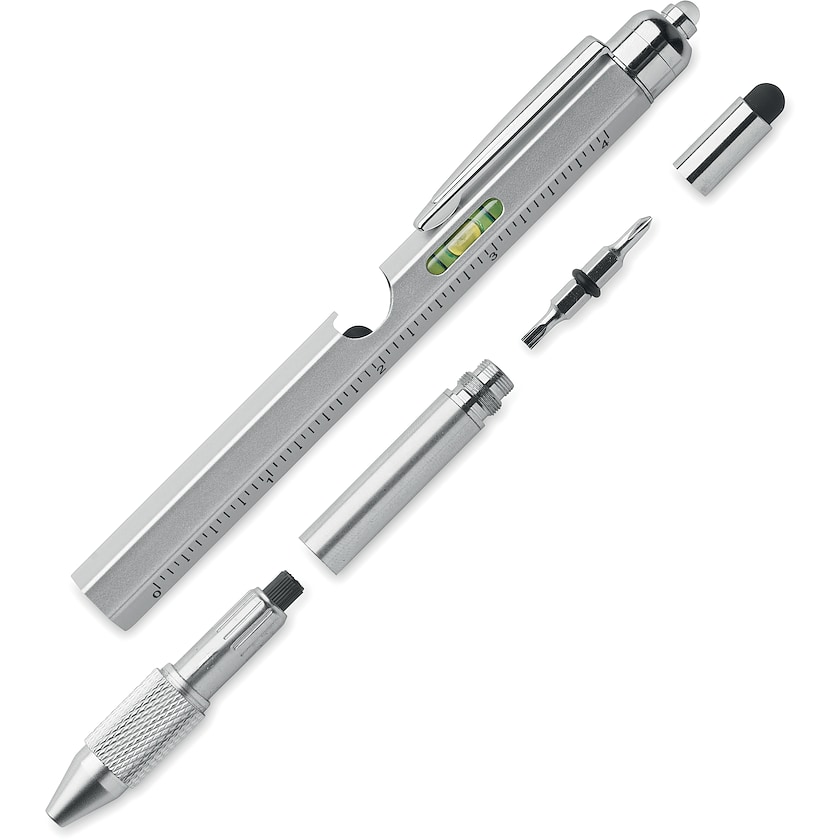 Stylo en acier inoxydable doté de plusieurs fonctions intelligentes. En plus d'un crayon, Catlin comprend également une règle, un niveau à bulle, des embouts pour tournevis cruciformes et à tête plate et une lampe. 3 piles AG incluses. Le meilleur ami de l'artisan.