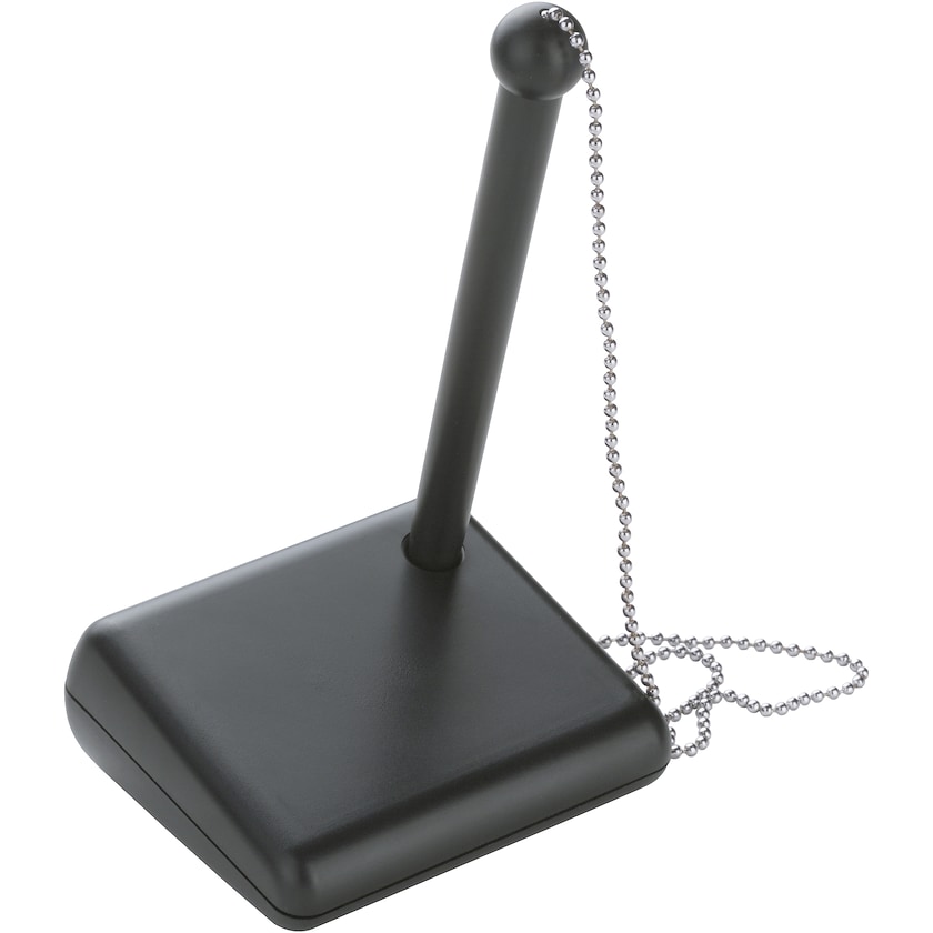 Stylo avec chaînette accrochée à un support. L'impression peut être effectuée soit sur le stylo soit sur le support. La chaînette est en métal et fait 50 cm de long. Livrée dans une boîte cadeau argentée.
