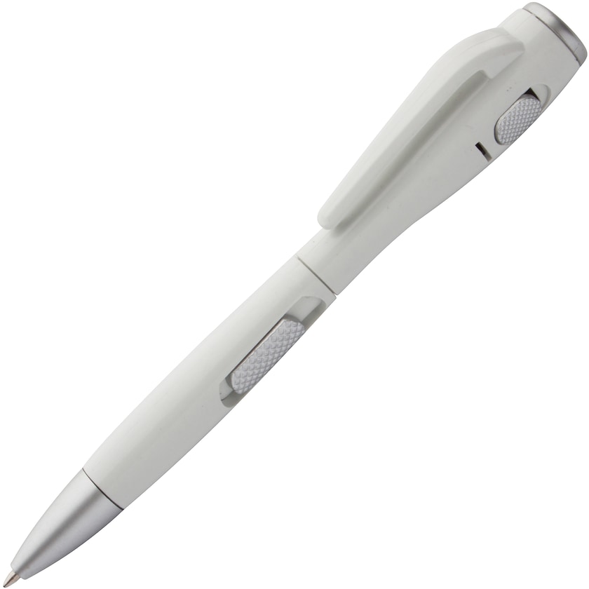Stylo lampe avec stylo bille et lampe LED. Le Ross est livré avec une pile bouton. Commandez vos stylos lampes personnalisés chez Axon Profil!