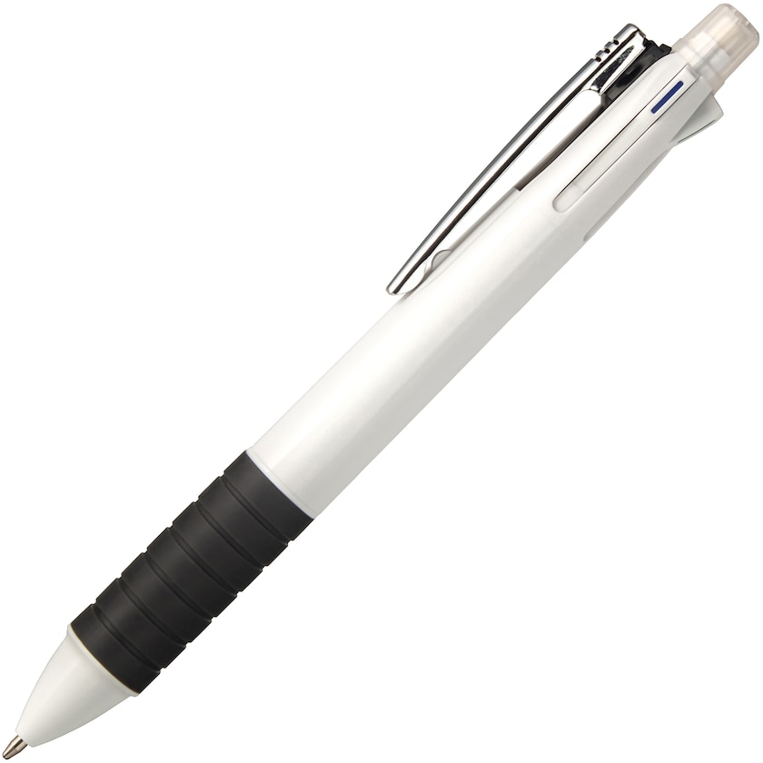 Stylo multifonction avec quatre couleurs différentes d'encres et une mine. Le stylo possède des encres de couleur bleue, noire, rouge et verte. La mine de crayon fait 0,5 mm. La mine peut être remplacée au besoin. Il possède une gomme à son extrémité.