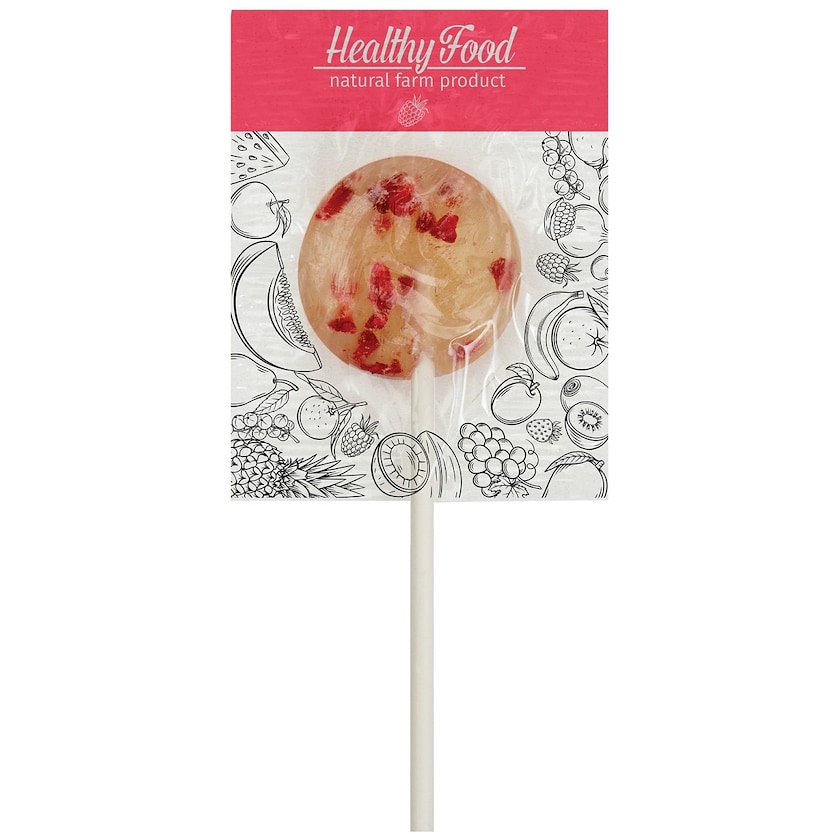 Sucette végane écologique avec de délicieux morceaux de fruits. Le bâtonnet de la sucette et son emballage sont fabriqués dans un matériau 100% biodégradable. Un bon choix pour vous qui recherchez une sucette écologique personnalisée.