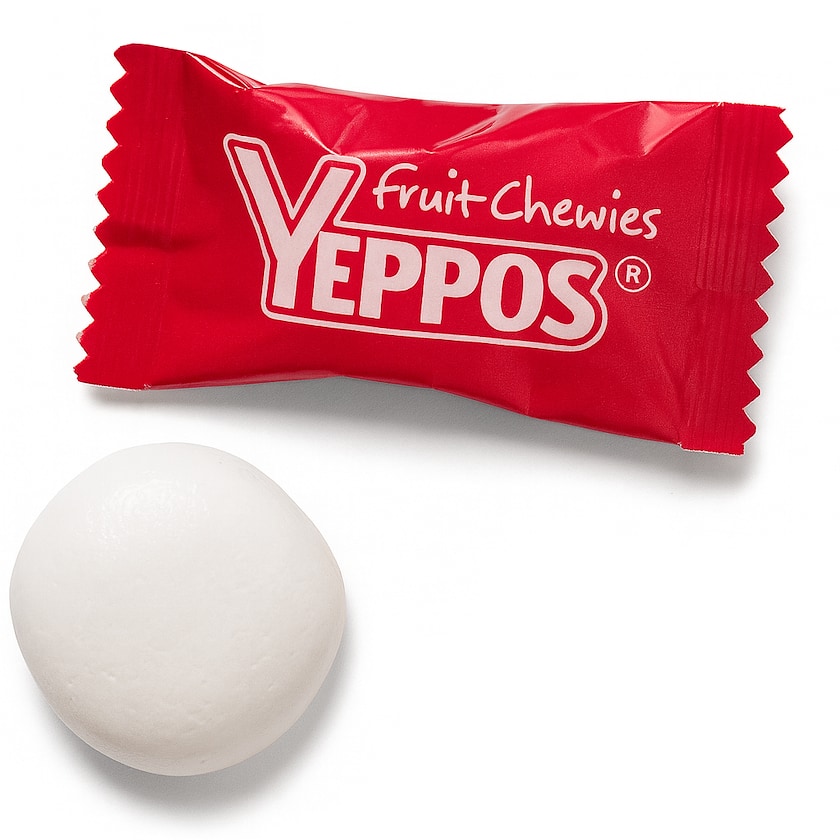 Chewies au goût de menthe ou de fruit en emballage flow pack. Dur à l'extérieur, mou à l'intérieur. Tous les bonbons doivent avoir le même goût.